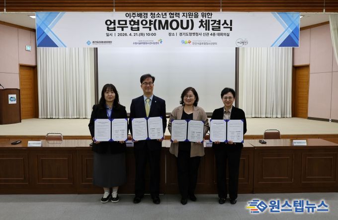 원스텝뉴스 이병희 기자 | 경기도미래세대재단은 21일 수원시 팔달구 옛 경기도청사에서 수원시글로벌청소년드림센터, 안산시글로벌청소년센터, 화성시글로벌청소년센터와 이주배경 청소년 지원을 위한 업무협약을 체결했다.