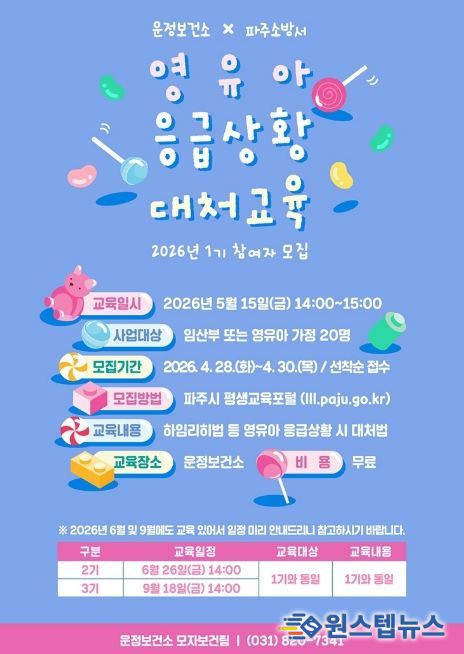 원스텝뉴스 이병희 기자 | 파주시 운정보건소는 영유아 가정의 안전 역량 강화를 위해 파주소방서와 연계해 ‘영유아 응급상황 대처교육’을 실시한다.
