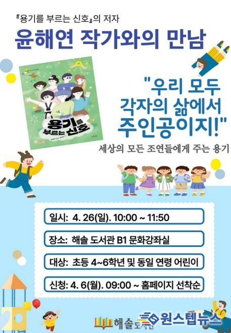 이번 행사는 해솔도서관 어린이 자료실 3~4월 전시 도서 연계 프로그램의 일환으로, 도서관 전시 도서에 대한 관심을 배가시키고, 어린이들이 직접 전시 도서의 주제(‘네 삶의 주인공이 되어줘!’)와 관련된 활동에 참여할 수 있도록 마련됐다. 특히, 윤해연 작가와 또래 친구들과 함께 그의 도서 '용기를 부르는 신호'(서유재, 2025)에 등장하는 인물들이 내는 서로 다른 용기를 들여다보며 주인공이란 특별한 능력을 지닌 사람이 아닌, 용기를 내고 한 걸음씩 나아가는 사람이라는 것을 깨닫게 되는 시간이 될 것으로 기대된다.