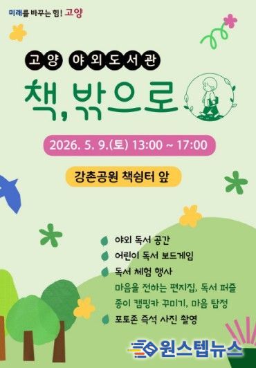 원스텝뉴스 천규영 기자 | 고양특례시는 오는 5월 9일 오후 1시부터 5시까지 일산동구 강촌공원 책쉼터 앞에서 고양 야외도서관 ‘책, 밖으로’를 운영한다.