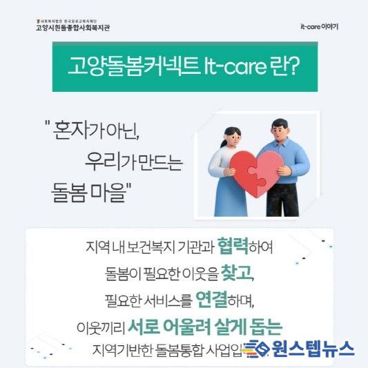 고양돌봄커넥트 It-care 사업은 복합적인 위기에 처한 주민들이 지역사회 안에서 건강하고 독립적인 생활을 유지할 수 있도록 보건과 복지 서비스를 하나로 잇는 통합돌봄 체계를 구축하는 사업이다.