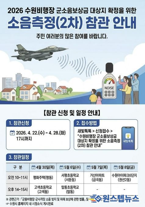 원스텝뉴스 이병희 기자 | 수원특례시가 수원비행장 인근 주민들의 소음 피해 보상 근거가 될 국방부의 ‘수원비행장 소음 영향도 조사 2차 소음측정’ 주민 참관 참여자를 모집한다. 4월 28일까지 새빛톡톡으로 신청할 수 있다.
