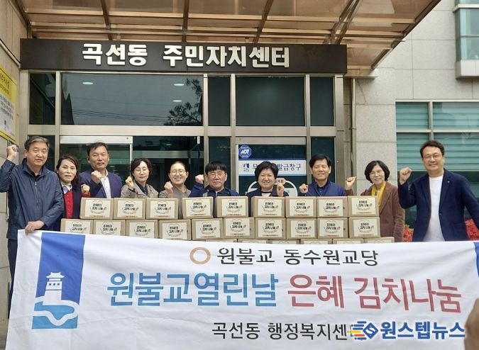 원스텝뉴스 이병희 기자 | 원불교 동수원교당은 지난 22일 수원시 권선구 곡선동 행정복지센터에서 봄맞이 ‘은혜김치 나눔’ 전달 행사를 개최하고, 정성껏 담근 김치 30박스를 곡선동에 전달했다.