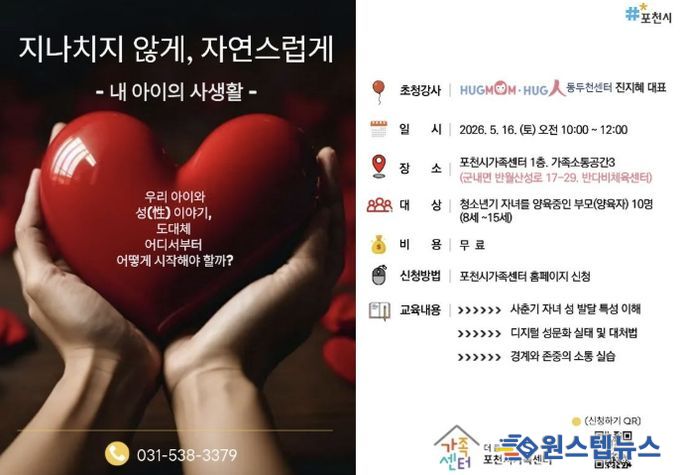 원스텝뉴스 이병희 기자 | 포천시 직영 더 큰 행복 포천시가족센터는 오는 21일부터 사춘기 자녀를 둔 양육자를 대상으로 부모 교육 프로그램 ‘지나치지 않게, 자연스럽게’의 참여자를 모집한다. 이번 교육은 5월 16일 오전, 포천시가족센터 가족소통공간(반다비체육센터 1층)에서 대면 강의로 진행된다.