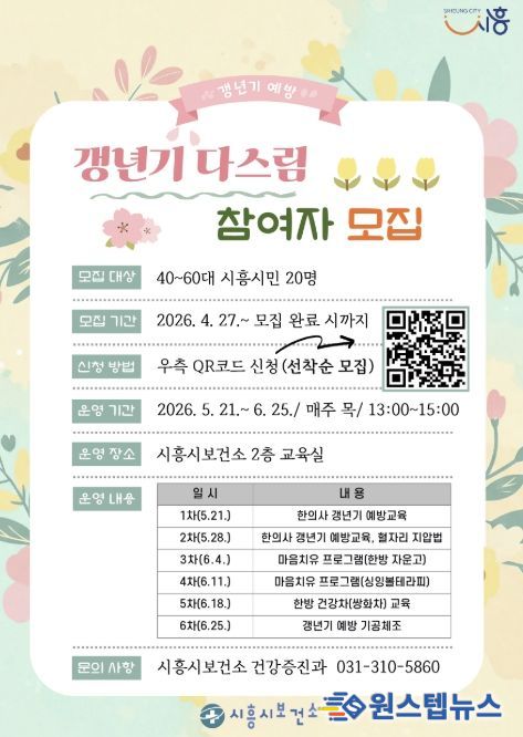 원스텝뉴스 이병희 기자 | 시흥시보건소는 올해부터 한의약 건강증진사업을 시범으로 운영하고, 40~60대 시흥시민을 대상으로 갱년기 신체ㆍ정신 건강관리를 지원하는 한의약 건강증진 프로그램 ‘갱년기 다스림’ 참여자를 모집한다.