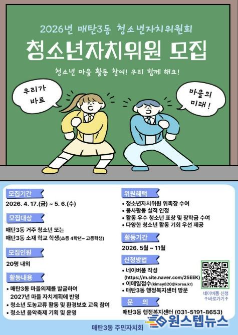 원스텝뉴스 이병희 기자 | 수원시 영통구 매탄3동은 매탄3동 주민자치회가 지역 청소년의 참여를 확대하고, 향후 지역사회를 이끌어 나갈 역량을 기르기 위해 2026년 청소년자치위원회 위원을 모집한다고 밝혔다.