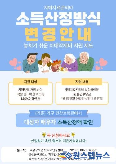원스텝뉴스 이병희 기자 | 고양특례시 일산서구보건소 치매안심센터가 치매 환자의 경제적 부담을 완화하고 지속적인 치료를 돕기 위해 ‘치매치료관리비 지원사업’의 대상자를 올해 상시 모집한다.