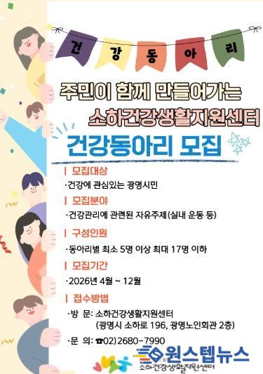 원스텝뉴스 이병희 기자 | 광명시 소하건강생활지원센터가 시민 스스로 건강을 관리하고 실천하도록 돕기 위해 오는 12월까지 ‘주민참여형 건강동아리’를 상시 모집한다.