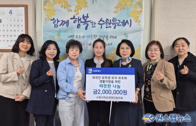 원스텝뉴스 이병희 기자 | 수원시 여성경영인협의회는 “한국으로 유학 온 뒤 미혼모로 출산한 외국인 유학생과 신생아의 안정적인 생활을 돕는 데 사용해 달라”며 24일 수원시에 200만 원을 전달했다.