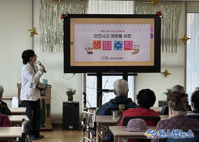 이번 교육은 일상생활에서 발생할 수 있는 안전사고 예방을 주제로, 기본 생활 수칙 안내와 함께 인공지능(AI) 트로트 음악에 맞춘 라텍스 밴드 생활 체조 활동으로 구성됐다. 참여자들은 음악에 맞춰 체조를 따라 하며 자연스럽게 신체활동에 참여하고, 퀴즈를 통해 교육 내용을 쉽고 재미있게 익히고 있다.