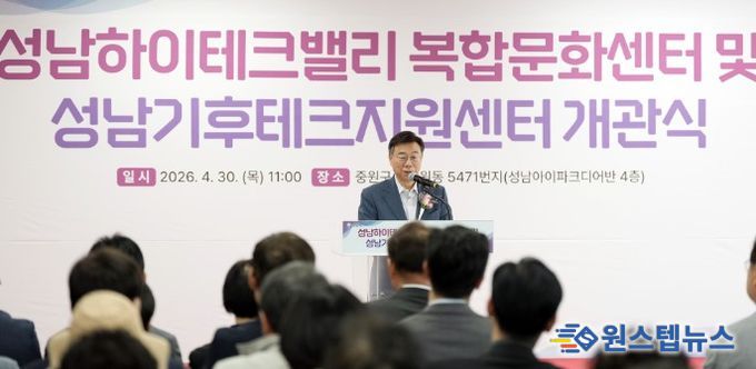 원스텝뉴스 이병희 기자 | 성남시가 산업단지 내 공공지원 기능을 강화하고 근로자 복지 증진과 기후테크 산업 육성을 위해 조성한 ‘성남하이테크밸리 복합문화센터’와 ‘성남 기후테크지원센터’가 4월 30일 오전 11시 개관식을 열고 본격적인 운영에 들어갔다.