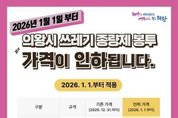 원스텝뉴스 이병희 기자 | 의왕시가 물가 상승 및 경기 침체로 인한 시민들의 경제적 부담을 완화하기 위해 2026년 1월 1일부터 쓰레기 종량제봉투 판매가격을 인하한다. 이번 가격 인하 대상은 일반용 및 재사용 종량제봉투이며, ▲5리터 봉투는 190원에서 150원으로 ▲10리터 봉투는 350원에서 300원으로 ▲20리터 봉투는 680원에서 550원으로 인하된다. 또한, ▲50리터 봉투는 1,700원에서 1,400원으로 ▲75리터 봉투는 2,630원에서 2,100원으로 각각 조정된다. 가격 인하 이전에 구매한 종량제봉투는 그대로 사용 가능하고, 음식물 종량제봉투, 공사장 생활폐기물 포대, 대형폐기물 신고필증은 가격 등은 변동 없다. 김성제 시장은 “종량제봉투는 시민 생활과 밀접한 만큼, 이번 가격 인하가 가계 부담 완화에 도움이 되길 바란다”며, “가격 인하 시점이 2026년 1월 1일이므로, 그전까지 각 가정에서 필요한 양만 구입해 주시길 바란다”고 전했다.