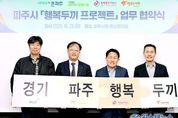 원스텝뉴스 이병희 기자 | 파주시는 ㈔딜로이트한마음나눔, 행복나래㈜, 행복도시락 사회적협동조합과 함께 결식 우려가 있는 외국인 노동자 자녀 지원을 위한 ‘행복두끼 프로젝트’업무협약을 체결했다고 밝혔다. 이날 협약식에는 최병갑 파주시 부시장을 비롯해 ㈔딜로이트한마음나눔 유병문 상임이사, 행복나래㈜ 조민영 본부장, 행복도시락 사회적협동조합 최준 사무국장 등 관계자들이 참석해, 아동복지 향상을 위한 상호 협력체계를 구축하기로 뜻을 모았다. 이번 협약을 통해 파주시는 결식 우려 아동을 추천하고, ㈔딜로이트한마음나눔, 행복나래㈜와 행복도시락 사회적협동조합은 해당 아동을 대상으로 도시락을 후원·제작·배송하는 역할을 맡게 된다. 이번 협약을 계기로 파주시 내 결식이 우려되는 외국인 노동자 자녀 40명이 지원을 받게 됐으며, ‘아프리카 10개국 이주민 노동자 공동체’는 해당 아동들이 정기적으로 도시락을 제공받게 된 것에 대해 깊은 감사의 마음을 전했다. 최병갑 파주시 부시장은 “파주시가 행복두끼 프로젝트 사업에 참여하게 되어 뜻깊다”라며 “앞으로도 지역사회 내 어려움을 겪는 아동들에게 희망을 전하는 따뜻한 사업이