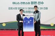 원스텝뉴스 이병희 기자 | 김포시는 17일 솔터실내테니스장에서 대한민국 테니스 스타 정현 선수의 김포시청 직장운동경기부 테니스팀 입단을 기념하고, 데이비스컵 2라운드 진출을 축하하는 행사를 개최했다. 이날 행사에는 김병수 김포시장을 비롯해 임청수 김포시체육회장, 박헌규 김포시테니스협회장과 테니스 관계자 및 동호인 등이 참석해 자리를 빛냈다. 행사는 시민과 동호인을 대상으로 한 팬 사인회를 시작으로 정현 선수의 주요 활약상을 담은 영상 상영, 기념 퍼포먼스, 입단 소감 및 축사 순으로 진행됐다. 특히 이날 행사에서는 정현 선수가 최근 데이비스컵 경기에서 실제 착용한 유니폼을 기념 액자로 제작해 김병수 시장에게 전달하는 의미 있는 시간이 마련됐다. 해당 유니폼은 국가대표 경기 특성상 소속팀 마크를 부착할 수 없음에도 불구하고, 정현 선수가 김포시청 입단을 기념하고 김포시를 알리기 위해 대한테니스협회에 요청해 특별히 김포시청 마크를 부착하고 출전한 것으로 알려져 의미를 더했다. 이어 김병수 시장은 정현 선수에게 꽃다발을 전달하고, 정현 선수의 유니폼에 김포시청 마크를 부착하는 퍼포먼스를 통해 김포시청 선