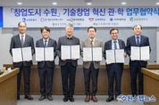 원스텝뉴스 이병희 기자 | 수원특례시가 경기창조경제혁신센터, 4개 대학과 협력해 대학의 기술창업을 발굴하고, 지원한다. 수원시와 경기창조경제혁신센터, 4개 대학은 30일 시청 상황실에서 ‘창업도시 수원 기술창업 혁신 관·학 업무협약’을 체결하고, 협력을 약속했다. 협약 기관들은 대학의 우수한 연구 성과, 인적 자원을 보유한 우수 기술창업기업을 발굴하고, 기술의 사업화를 촉진하기 위해 협력하기로 했다. 수원시는 수원기업새빛펀드의 수원기업 의무투자 약정액으로 투자를 유치하고, 경기창조경제혁신센터는 기업에 멘토링, 엑셀러레이팅(스타트업이 빠르게 성장하도록 지원), 밋업(투자자 유치 행사), 아이알(IR)데이, 투자 등을 지원한다. 대학교는 실험실 창업·창업 보육기업을 추천한다. 이날 협약을 바탕으로 대학창업 특화 프로그램인 ‘새빛 유-테크(U-Tech).판’을 시작한다. 경기창조경제혁신센터의 엑셀러레이팅 인프라를 활용해 우수한 기술력과 성장 잠재력을 갖춘 창업기업을 발굴하고, 기업의 투자 유치 역량을 극대화하는 프로그램이다. 3대 핵심 목표는 ‘인프라 적극 활용’, ‘선순환 구조 구축’, ‘실질적 투자