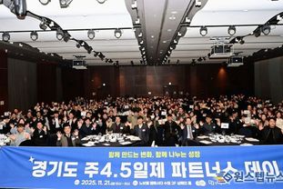 원스텝뉴스 이병희 기자 | 경기도는 21일 수원 노보텔 엠버서더 샴페인홀에서 ‘주4.5일제 참여기업 파트너스 데이’를 개최하고, 도내 참여기업과 함께 노동시간 단축 문화 확산을 위한 정책 방향과 운영 성과를 공유하는 시간을 가졌다. 파트너스데이에는 주4.5일제 도내 참여기업의 노사 대표와 김대순 경기도 행정2부지사, 홍성호 경기도 노동국장 등 총 220여 명이 함께했다. 행사는 ‘함께 만드는 변화, 함께 나누는 성장’의 슬로건 아래 진행됐으며, ▲참여기업 노동시간 단축 우수사례 발표 ▲업종별 라운드테이블 네트워킹 등 실제 기업 운영 경험과 향후 변화 대응을 중심으로 의견을 공유하고 소통했다. 특히 참여기업과 컨설팅 업체에서 노동시간 단축 운영 성과와 IT(정보통신 기술) 솔루션 도입 사례 등을 발표하며, 노동환경 개선과 생산성 향상을 실현한 구체적 사례를 공유했다. 또한, 업종별 라운드테이블에서는 기업별 제도 운영 과정에서의 애로사항과 개선 아이디어, 정책 건의사항 등을 논의하며, 앞으로의 지원 방향과 제도 안정화를 위한 실질적 소통이 이뤄졌다. 김대순 행정2부지사는 “시범사업을 통해