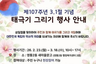 원스텝뉴스 이병희 기자 | 영통구 영통2동은 영통2동 새마을문고가 제107주년 3·1절을 맞아 지역 주민과 함께 독립운동의 뜻을 기리고 나라사랑의 의미를 되새기기 위한 ‘태극기 그리기’ 행사를 운영한다고 밝혔다. 이번 행사는 오는 3월 18일까지 매일 오전 10시부터 오후 5시까지 영통2동 새마을문고에서 진행되며, 전 연령대 누구나 현장 접수를 통해 참여할 수 있다. 참가자들은 직접 태극기와 무궁화를 그리며 3·1운동 정신을 생활 속에서 체험하는 시간을 갖는다. 제출 시 룰렛 돌리기를 통해 소정의 상품도 증정할 예정이다. 영통2동 새마을문고는 앞으로도 독서문화 활동과 연계한 다양한 생활문화 프로그램을 통해 주민 참여의 장을 넓히고, 지역의 역사·문화 가치를 함께 나누는 활동을 이어갈 계획이다.