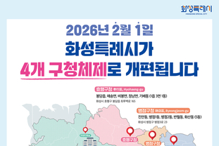 원스텝뉴스 이병희 기자 | 화성특례시가 4개 일반구청 개청이라는 행정 체계 대전환을 2주 앞두고 막바지 준비에 총력을 기울이고 있다. 화성특례시는 지난해 8월 행정안전부로부터 4개 일반구(만세구, 효행구, 병점구, 동탄구) 동시 승인을 받은 이후, 청사 운영, 인력 배치, 행정시스템 구축 등 성공적인 개청을 위해 전 부서가 합심해 매진해왔다. 4개 구청별 관할 구역 및 위치 확정 ,이번에 신설 및 전환되는 4개 구청은 시민들의 생활권에 맞춘 밀착형 행정 서비스를 제공하게 된다. 구청명 위치 관할 구역 만세구청 화성종합경기타운 우정·향남·남양읍, 마도·송산·서신·팔탄·장안·양감면, 새솔동 효행구청 봉담읍 최루백로 165 봉담읍, 매송·비봉·정남면, 기배동 병점구청 기존 동부출장소 진안·병점1·2·반월·화산동 동탄구청 기존 동탄출장소 동탄1동 ~ 동탄9동 역대 최대 규모 인사 단행 및 실무 준비 완료 화성시는 행정 공백을 최소화하고 안정적인 서비스 운영을 위해 개청일보다 약 2주 앞선 지난 16일, 1,600여 명 규모의 역대 최대 인사를 단행했다. 지난 19일에는