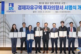 원스텝뉴스 이병희 기자 | 제1회 광교 양자 바이오 서밋에 참가한 9개 첨단바이오 기업이 경제자유구역 투자의향서에 서명했다. 수원시는 24일 수원컨벤션센터 VIP 다이닝룸에서 ‘경제자유구역 투자의향서 서명식’을 열었다. 바이오에프디엔씨, 엠피오스, 한국바이오셀프, 아바타테라퓨틱스, 아반트릭스, 오가노플러스, 메디셀헬스케어, 하드사이언스, 파이헬스케어 등 9개 기업이 투자의향서에 서명했다. 서명식에는 김현수 수원시 제1부시장과 서명 기업 대표 등이 참석해 협력 방안을 논의했다. 김현수 제1부시장은 “오늘 서명식은 수원시가 지향하는 바이오·AI(인공지능) 혁신 생태계의 출발점”이라며 “기업의 투자는 수원의 미래를 함께 열어가는 동력이 될 것”이라고 말했다. 수원시는 330만㎡(100만 평) 규모의 수원경제자유구역을 추진 중이다. 지난 4월 경기경제자유구역 추가 지정 후보지 공모에 선정돼 수원 경제자유구역 지정을 향한 첫 관문을 통과했다. 경기도와 함께 개발계획을 수립해 내년 6월 산업통상자원부에 경제자유구역 지정을 신청한다. 심사를 통과하면 2026년 11월 경제자유구역으로 지정된다.