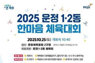 원스텝뉴스 천규영 기자 | 운정1·2동 체육회는 오는 25일 운정체육공원(가람로 150번길 41-33)에서 ‘2025 운정1·2동 한마음 체육대회’를 개최한다고 밝혔다. 이번 2025 운정1·2동 한마음 체육대회는 작년에 이어 두 동이 함께 개최하면서 운정 1·2동 주민들의 건강증진과 화합을 이루는 데 중점을 뒀다. 행사는 오전 10시 40분 개회식을 시작으로, ▲어린이 장애물 달리기 ▲신발 양궁 등 온 가족이 즐길 수 있는 다양한 체육 프로그램이 진행될 예정이다. 또한 ▲고고장구 ▲태권도 시범단 ▲거리 공연 ▲파주시 홍보대사 김설·김성대의 축하공연이 더해져 풍성한 볼거리를 제공한다. 지역사회에서 후원한 다양한 경품도 준비되어 있으며, 참가자들의 편의를 위해 주요 아파트 단지 앞에서 승차할 수 있는 순환 버스를 운영할 계획이다. 이대영 운정2동 체육회장은 “같은 생활권을 가진 운정1동과 운정2동 주민들이 한자리에 모여 여유를 즐기고 화합할 수 있는 장이 될 수 있도록 열심히 준비했다”라며 “행사가 성공적으로 운영될 수 있도록 주민들의 많은 참여를 부탁드린다”라고 전했다.