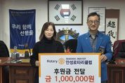 원스텝뉴스 이병희 기자 | 안성시동부무한돌봄네트워크팀은 지난 26일 국제로타리 3600지구 안성로타리클럽으로부터 촘촘한 복지 안전망 구축을 위한 후원금 100만 원을 전달받았다. 안성로타리클럽은 매년 지역사회를 위한 봉사와 나눔을 실천하며 지역 발전에 기여해 왔으며, 이번 후원금은 복지 사각지대 발굴과 사례관리 대상자에게 전문적인 복지 서비스를 제공하는 데 사용될 예정이다. 안성로타리클럽 이승재 회장은 “현장에서 발로 뛰며 소외된 이웃을 찾는 안성시동부무한돌봄네트워크팀의 활동에 실질적인 도움이 되길 바란다”며 “앞으로도 지역사회의 다양한 사회공헌 프로젝트를 통해 지역 복지 서비스의 질을 높이는 마중물이 되겠다”고 말했다. 안성시동부무한돌봄네트워크팀 정은주 센터장은 “복지 사업을 더욱 안정적이고 원활하게 추진할 수 있도록 도움을 주신 안성로타리클럽에 깊이 감사드린다”며 “지역 주민에게 필요한 맞춤형 복지 서비스를 제공하는 데 최선을 다하겠다”고 말했다
