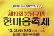 원스텝뉴스 천규영 기자 | ‘제19회 분당구민 한마음 축제’가 오는 10월 25일 오전 9시 30분~오후 1시 중앙공원 야외공연장에서 열린다. 성남시 분당구가 후원하고 분당구민 한마음 축제 추진위원회(위원장 김성민)가 주최해 열리는 이번 행사는 지역사회 화합 분위기를 조성하고자 ‘함께 여는 미래, 함께 만드는 분당’을 주제로 진행된다. 이날 성남시립합창단과 시민 예술단 아인스바움의 공연으로 축제의 화려한 막을 연다. 이어 수내3동, 정자3동, 야탑1동, 백현동 주민자치센터 문화 프로그램에 참여 중인 4개 팀이 난타, 한국무용, 줌바, 에어로빅 등 흥겨운 공연으로 중앙무대를 꾸민다. 초청 가수 김용필(미스터트롯2 출신)의 ‘오히려 좋아’, ‘낭만의 계절’, 바이올리니스트 백진주와 소프라노 유경진이 듀엣으로 연주하는 영화음악(OST) ‘캐리비안의 해적’, ‘대부’, 성남청년프로예술단의 댄스 공연도 열려 축제 분위기를 달군다. 중앙공원 황새울광장에는 배틀 로봇, 4족 보행 로봇 등 6개의 4차산업 체험존, 시민 체험용 드론 축구존, 추억의 사진관을 차려 운영한다. 장애인 복합사업장인 굿윌스토