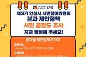 원스텝뉴스 이병희 기자 | 안성시는 오는 18일 오후 6시까지 시민참여위원회 분과별 제안 정책에 대한 시민 의견을 수렴한다고 밝혔다. 이번 시민 의견 수렴은 시민참여위원회 정책 발표회를 앞두고 진행하는 사전심사로, 분과별 제안 정책에 대한 시민 공감도를 확인하여 추후 현장심사 결과와 함께 최종 우수 제안 정책을 선정하는 데 활용된다. 7개 분과로 구성된 안성시 시민참여위원회는 소속 위원의 다양한 경험과 지속적인 논의를 바탕으로 안성시 시정에 반영할 정책 연구 활동을 추진해 왔으며, 이달 정책 발표회를 통해 각 분과에서 도출한 정책을 제안하여 그간 활동의 결실을 맺을 예정이다. 정책 발표회를 통해 각 분과에서 제안할 정책 주제는 ▲Safety 안성, 시민이 안전한 도시 만들기(공공혁신분과) ▲안성시 평생학습도시에 따른 평생교육 강사 플랫폼 구축(교육특화분과) ▲안성시 한우산업 탄소중립 모니터링 시스템 구축(미래농업분과) ▲안성시민을 위한 태양광발전 5개년 계획(생태도시분과) ▲전통문화 예술인들을 위한 창작공간 확보(문화도시분과) ▲안성, 사랑 흔들바위 관광지 조성(문화도시분과) ▲더불어 이동하는 자유로운 안성(생