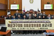 원스텝뉴스 이병희 기자 | 해운대구의회 의회운영위원회는 지난 12월 23일부터 24일까지 1박 2일간의 일정으로 경주시 일원을 방문해 선진 의회 시설을 비교·분석하고 의정 역량 강화를 위한 벤치마킹을 실시했다. 이번 시찰에는 김상수 의회운영위원장과 해운대구의회 의장을 포함한 의원 10명, 의회사무국 직원 4명 등 총 14명이 참여했다. 시찰단은 24일 오전 경주시의회를 공식 방문하여 약 3년 전 전면 리모델링을 통해 현대화된 청사 시설을 중점적으로 둘러보았다. 시찰단은 특히 본회의장과 각 상임위원회 회의실이 최신식 설비로 갖춰진 점과, 각 상임위원장실이 별도로 마련되어 있고 넓고 쾌적한 의원 사무실이 조성되어 있는 등 의정 활동을 지원하는 인프라가 매우 우수하다는 점에 주목했다. 현장을 둘러본 의원들은" 경주시의회의 경우 상임위원장실과 의원 연구 공간이체계적으로 분리·배치되어 있고, 회의실 시설 또한 현대적으로 개선되어 있어 의정 활동의 효율성을 높이는 데 크게 기여하고 있다"고 평가했다. 또한, 직원들의 사무 공간이 업무 집중도를 높일 수 있도록 효율적으로 배치된 점과 모든 직원이 명