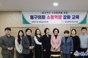 원스텝뉴스 이병희 기자 | 인천 동구의회는 지난 19일 의회 세미나실에서 구의원과 의회사무과 공무원을 대상으로 소통 역량 강화 교육을 실시했다. 이번 교육은 이미지 컨설팅 및 커뮤니케이션 교육 전문강사인 김미선 강사를 초빙해 ‘언어적·비언어적 커뮤니케이션 능력의 활용 및 전략 수립’을 주제로 강의가 진행됐다. 김미선 강사는 이날 갈등 상황에서의 대화 기술과 정책 설명 시 설득력을 높이는 언어적 소통 기법을 소개했다. 아울러 의정활동 과정에서 주민에게 신뢰를 줄 수 있는 이미지 등 비언어적 소통 기법의 중요성도 강조했다. 또한 의원 개인별 이미지에 적합한 표정, 자세, 외형 등 다양한 전략을 제시하며 주민과의 긍정적 첫인상을 형성하고 소통의 신뢰도를 높일 수 있는 실질적인 방법을 안내했다. 유옥분 의장은 “의정활동에서의 소통 능력은 정책 메시지를 효과적으로 전달하는 중요한 역량”이라며, “이번 교육이 의원들이 주민과의 소통에서 신뢰를 구축하고, 의정활동을 보다 원활하게 수행하는 데 큰 도움이 될 것”이라고 말했다.