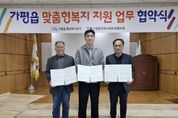원스텝뉴스 이병희 기자 | 가평군 가평읍 행정복지센터는 최근 가평읍지역사회보장협의체(지사협), 유일닭강정과 ‘맞춤형복지 지원 업무협약’을 체결했다. 이번 협약으로 유일닭강정은 매월 가평읍 맞춤형복지팀에서 추천한 저소득계층 10가정에 닭강정을 지원해 주기로 했다. 장석조 가평읍장은 “복지사각지대 발굴뿐 아니라 민간 자원 연계가 복지 수준을 높이는 데 큰 역할을 한다”며 “이번 협약이 공공자원만으로는 충족하기 어려웠던 복지수요를 보완하는 데 큰 도움이 될 것”이라고 말했다. 유병훈 유일닭강정 대표는 “우리 지역 주민들과 마음을 나누고 싶어 맞춤형복지 지원 협약에 참여했다”며 “앞으로도 어려운 이웃을 위한 나눔과 봉사를 꾸준히 실천하겠다”고 밝혔다.
