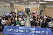 원스텝뉴스 천규영 기자 | 평택시는 지난 19일 중앙동 행정복지센터 대회의실에서 ‘서정역세권 도시재생사업 성과공유회’를 성황리에 개최했다. 이 성과공유회는 2023년 선정되어 추진 중인 경기 더드림 서정역세권 도시재생사업의 2025년 실적을 시민들에게 소개하는 뜻깊은 자리로 마련됐다. 2025년 플레이55 문화·예술프로그램을 통해 주민들이 직접 배워온 민요와 난타 실력을 방문객들 앞에서 선보여 큰 환호를 얻었으며, 주민 MC가 약 20분간 도시재생사업에 대한 주민의 다양한 의견과 응원 메시지를 전달하는 ‘소감나눔 토크콘서트’를 진행하여 주민참여형 도시재생사업의 취지에 맞도록 진행했다. 또한, 행사에서는 1년 동안 추진해 온 서정역세권 도시재생사업의 추진 성과를 한눈에 볼 수 있는 전시가 열려, 주민들이 도시재생사업으로 추진되는 다양한 사업 내용 및 추진 과정을 직접 확인할 수 있는 좋은 기회가 됐다. 더불어, 이번 성과공유회는 포토존, 응원 메시지 전달, 소감나눔 토크콘서트 등 송년회 분위기로 마련되어 방문객들에게 따듯한 분위기를 만들었다. 시 관계자는 “도시재생은 기본적으로 지역공동체를 기반으로