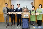 원스텝뉴스 이병희 기자 | 전북특별자치도의회는 18일 의장실에서 하나예술창작센터의 장애인 예술 창작활동 지원과 노후 시설 보완 등에 활용해 달라며 기부물품 바자회 수익금 330만 원을 전달했다. 이번 전달식은 지난달 21일 도의회 현관 앞에서 전북특별자치도의회와 아름다운가게 전북본부가 함께 의원 및 사무처 직원들의 물품을 기부받아 진행한 바자회 판매 수익금을 모아 소외된 이웃을 돕기 위해 마련됐다. 문승우 의장은 “의원들과 직원들이 기부한 물품이 다시 지역사회에 따뜻한 나눔으로 돌아간다는 점에서 의미가 크며, 자원순환 캠페인에도 함께 동참할 수 있어 더욱 뜻깊다”며, “행사에 참여해 주신 의원님들과 직원분들게 감사드리며 앞으로도 도민과 함께하는 사회공헌 활동을 이어가겠다”고 말했다. 수익금을 전달받은 전해진 센터장은 “도의회의 따뜻한 나눔이 어려운 이웃에게 큰 힘이 될 것”이라며 “전달된 기금은 장애인 예술가들의 창작활동에 필요한 물품 지원과 노후 장비 보완에 소중하게 사용하겠다.”고 말했다.