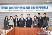 원스텝뉴스 이병희 기자 | 전북특별자치도의회 기획행정위원회 최형열 위원장(전주5)은 18일 도의회 세미나실에서 ‘전북형 출생기본수당 도입을 위한 정책세미나’를 개최했다. 전북형 출생기본수당은 전북에서 태어난 신생아가 성인이 될 때까지 매월 일정 금액을 현금으로 지급하는 정책을 말한다. 성인이 될 때까지 월 250유로(한화 약 43만 원)를 지급하는 독일의 ‘킨더겔트’에 뿌리를 두고 있고, 최근 전남이 매월 20만 원을 지급하는 출생기본수당을 도입․시행해 주목받고 있다. 이에 최 위원장은 지난 3월 도정질문을 통해 전북형 출생기본수당의 도입을 제안했고, 이번 세미나도 앞선 도정질문에 관한 논의를 확장하기 위해 기획했다고 밝혔다. 이날 세미나에는 전남연구원의 최지혜 부연구위원이 ‘전라남도 출생기본수당 도입의 쟁점과 과제’를 주제로 발제를 진행했고, 한양대 정책학과 이삼식 교수, 군산대 사회복지학부 서정희 교수, 전북도 인구청년정책과 인구정책팀 박선미 팀장, 전북연구원 인구청년지원연구센터 이주연 센터장이 토론자로 참여했다. 최지혜 부연구위원은 발제를 통해 “저출생․고령화로 인한 인구구조 변화가 가속화되고 있고, 이는