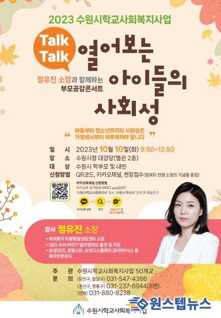 ‘TalkTalk(톡톡) 열어보는 아이들의 사회성’을 주제로 열리는 이날 부모공감콘서트는 학교사회복지사업 50개교가 주관한다. 수원시 학교사회복지사업을 소개하고, 학부모들의 의견을 듣는다. 정유진 하이토닥 아동발달상담센터 소장의 강연으로 이뤄지는 학부모 연수도 있다.