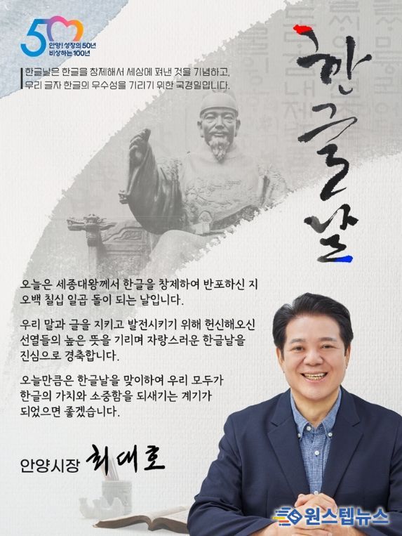 원스텝뉴스 천수호 기자 | 최대호 안양시장은 9일 자신의 SNS에 올린 ‘제577돌 한글날 경축사’를 통해 “우리 말과 글을 지키고 발전시키기 위해 헌신해 오신 선열들의 높은 뜻을 기리며 자랑스러운 한글날을 진심으로 경축한다”고 밝혔다.