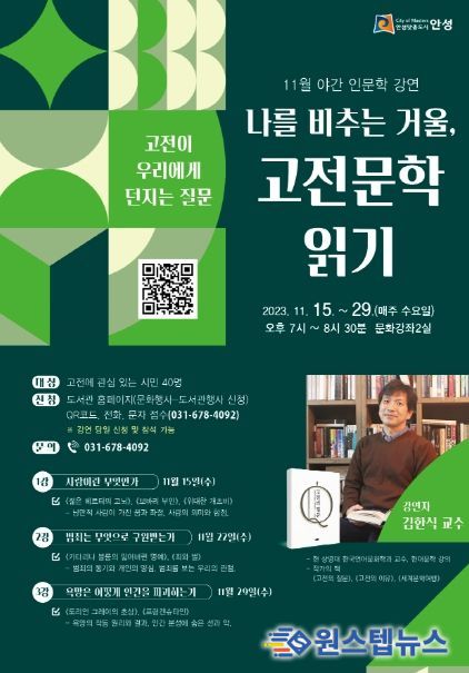 원스텝뉴스 천수호 기자 | 안성시 진사도서관은 11월 한 달간 세 차례에 걸쳐 ‘나를 비추는 거울, 고전문학 읽기’ 야간 인문학 강연을 진행한다. 혼자 읽기 어려운 고전문학을 쉽게 이해할 수 있도록 《고전의 질문》의 저자인 김한식 교수가 인물에 대한 공감 측면에서 해설한다.