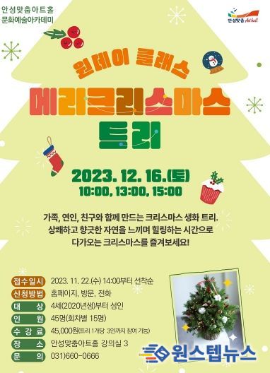 원스텝뉴스 천수호 기자 | 안성맞춤아트홀은 오는 12월 16일 원데이 클래스를 운영한다. 이번 강좌는 크리스마스 분위기를 한껏 돋아주는 나만의 생화 트리 만들기 수업으로, 4세 이상 모든 이를 위한 강좌이다. 10시, 13시, 15시 총 3회에 걸쳐 진행되며 회차별 15명씩 45명이 참여할 수 있다. 신청은 11월 22일부터 선착순으로 접수 가능하다.