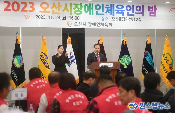 원스텝뉴스 천수호 기자 | 오산시는 지난 24일 오후 4시 오산웨딩의전당에서 선수들과 관계자들의 노고 위로 및 성과 축하를 위해 연‘2023 오산시 장애인체육인의 밤’행사가 성황리에 종료됐다고 밝혔다.