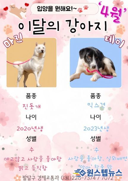 현재 팔달구 홈페이지 화면에서 ‘이달의 강아지’ 배너를 클릭하면 4월의 강아지 두 마리를 확인해 볼 수 있다. 4월에 소개하는 ‘이달의 강아지’는 진돗개인 ‘마진이’와 믹스견인 ‘테미’다. 팔달구청 방문 시 팔달구청 1층에 있는 전자게시판을 통해 이달의 강아지를 확인할 수도 있다. 팔달구에서는 매월 새로운 유기견을 소개할 예정이다.