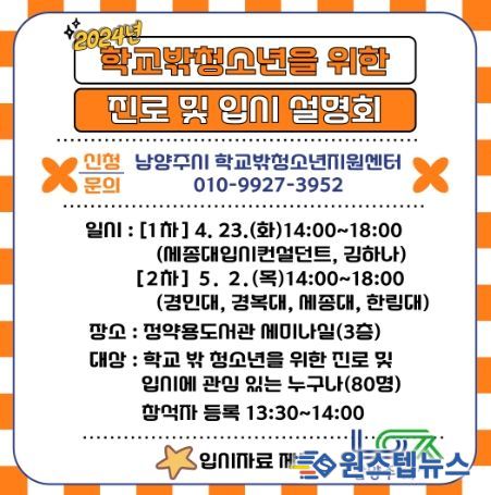 원스텝뉴스 이병희 기자 | 남양주시에서 운영하는 꿈드림센터(학교밖청소년지원센터)는 오는 4월 23일과 5월 2일 오후 2시부터 정약용도서관 세미나실에서 ‘2024년 학교 밖 청소년을 위한 진로 및 입시 설명회’를 개최한다.