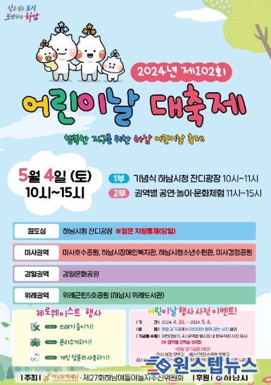 원스텝뉴스 천규영 기자 | 하남시는 제102회 어린이날을 하루 앞둔 5월 4일 오전 10시부터 오후 3시까지 4개 권역(원도심·미사·감일·위례)에서 어린이날 대축제를 실시한다.