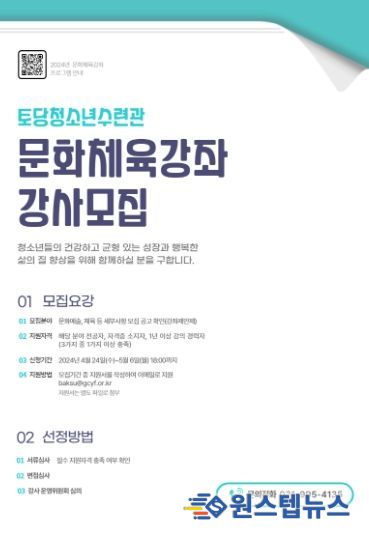 접수는 토당청소년수련관 누리집에서 응시원서를 내려 받아 5월 6일까지 이메일로 제출하면 된다. 서류심사를 통해 필수 자격요건 충족 여부를 확인한 후 면접 심사와 강사운영위원회 심의를 거쳐 최종적으로 선발된다.