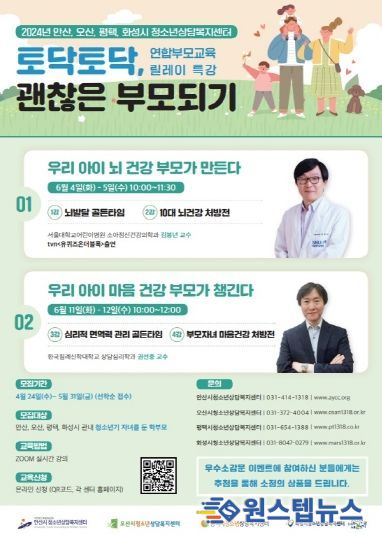 릴레이 특강은 청소년기 자녀의 뇌 건강 및 마음건강에 관한 내용이 강연된다. 6월 4일과 6월 5일 10시에는 김붕년 교수(서울대학교 어린이병원 소아정신건강의학과)가 “우리아이 뇌 건강, 부모가 만든다”라는 주제로 강의하고, 6월 11일, 6월 12일은 10시에는 권선중 교수(한국침례신학대학교 상담심리학과)가 “우리아이 마음건강, 부모가 챙긴다”라는 주제로 온라인 교육을 진행한다.