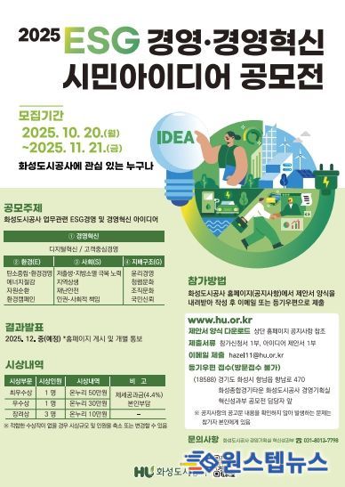 원스텝뉴스 이병희 기자 | 화성도시공사는 오는 10월 20일부터 11월 21일까지 ‘2025년 ESG경영·경영혁신 시민 아이디어 공모전’을 개최한다고 밝혔다.