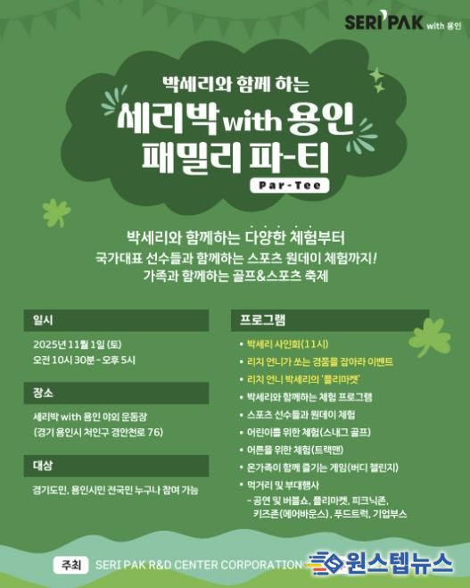 원스텝뉴스 천규영 기자 | 용인특례시는 11월 1일 오전 10시 30분부터 오후 5시까지 처인구 경안천로 76에 위치한 ‘SERI PAK with 용인’ 야외운동장에서 골프 레전드 박세리 전 감독과 함께하는 ‘SERI PAK with 용인 패밀리 파티(Par-Tee)’를 개최한다고 21일 밝혔다.