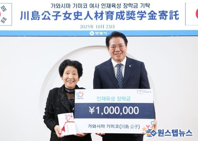 원스텝뉴스 이병희 기자 | 안양시는 일본 고마끼시 일한친선협회 상임고문인 가와시마 기미코(川島 公子) 여사가 안양시 인재육성재단에 100만엔(한화 약 942만원)을 기부했다고 24일 밝혔다.