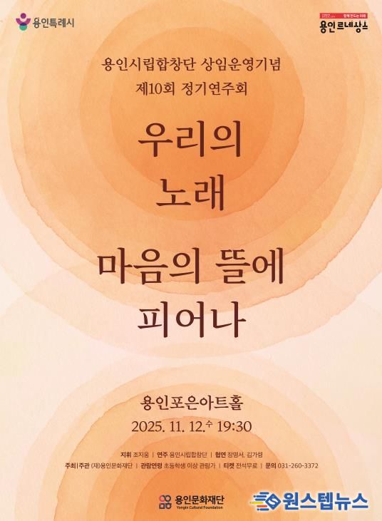원스텝뉴스 천규영 기자 | (재)용인문화재단은 오는 11월 12일 오후 7시 30분, 용인포은아트홀에서 용인시립합창단 상임 운영기념 ‘제10회 정기연주회’'우리의 노래, 마음의 뜰에 피어나'를 개최한다.