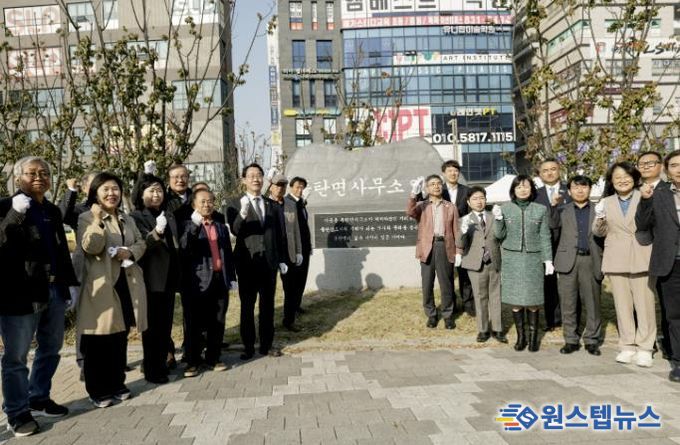 원스텝뉴스 천규영 기자 | 화성특례시 오산동 996-4번지 옛 동탄면사무소 자리에 표지석을 설치하고 지난 4일 제막식을 개최했다.