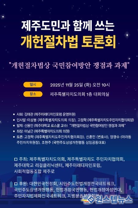 원스텝뉴스 이병희 기자 | 제주특별자치도의회, 제주특별자치도 주민자치위원회협의회, 제주대학교 리걸클리닉센터, 제주미래디자인포럼, 사회적협동조합 제주로 공동 주최로 11월 25일 오전 10시, 제주특별자치도의회 1층 대회의실에서 '제주도민과 함께 쓰는 개헌절차법 토론회'를 개최한다.