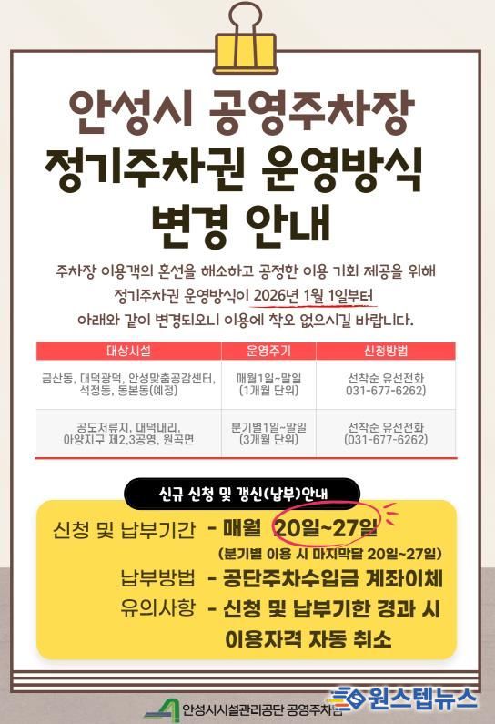 원스텝뉴스 이병희 기자 | 안성시시설관리공단은 공영주차장 이용객의 혼선을 방지하고 공정성 확보 및 관리 효율화를 위해 정기주차권 운영 방식을 전면 개편하고 2026년 1월 1일부터 시행한다고 밝혔다.